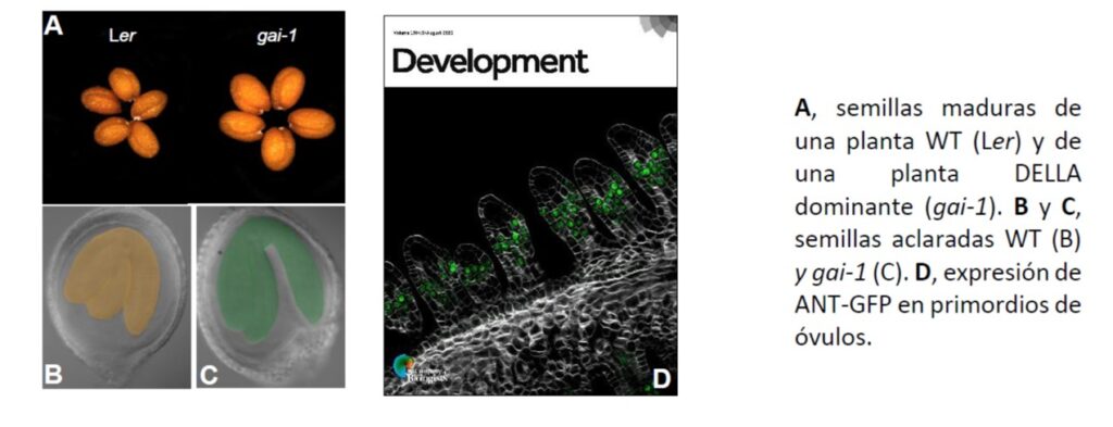 Gibberellins (GAs) are plant hormones that regulate numerous physiological processes such as germination, stem elongation, flowering, and fruiting. Genetic and molecular studies have enabled the identification of the components involved in the GA perception and signaling cascade, with DELLA proteins being the most relevant. DELLA proteins are repressors of GA signaling that regulate GA-promoted growth and differentiation. At the molecular level, these proteins are transcriptional regulators that act as activators or repressors through interactions with other transcription factors. Our group has demonstrated the involvement of DELLA proteins as positive regulators of seed size, such that dominant DELLA mutants produce larger seeds. Our current objective is to understand how DELLA proteins regulate seed size at the molecular level in Arabidopsis, with the aim of using this knowledge to increase the yield of agronomically important species such as Camelina sativa.